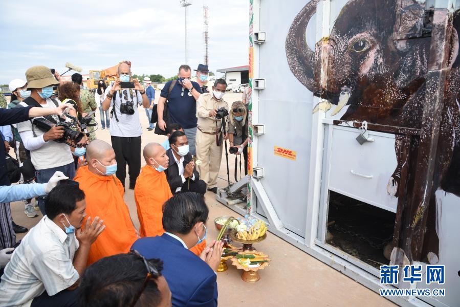 11月30日,在柬埔寨暹粒國際機場,僧人為大象“卡萬”祈福。