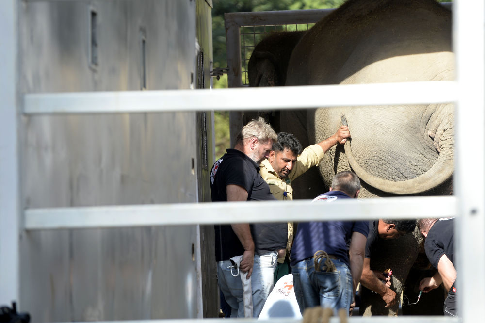 ↑11月29日,在巴基斯坦伊斯蘭堡,工作人員為運(yùn)輸大象做準(zhǔn)備
