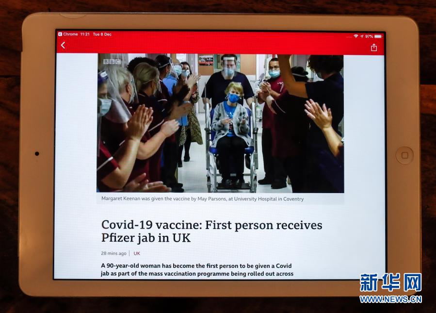 12月8日在英國(guó)倫敦拍攝的播放新聞的電腦屏幕顯示,醫(yī)護(hù)人員為該國(guó)首位接種新冠疫苗的90歲女子瑪格麗特·基南鼓掌。
