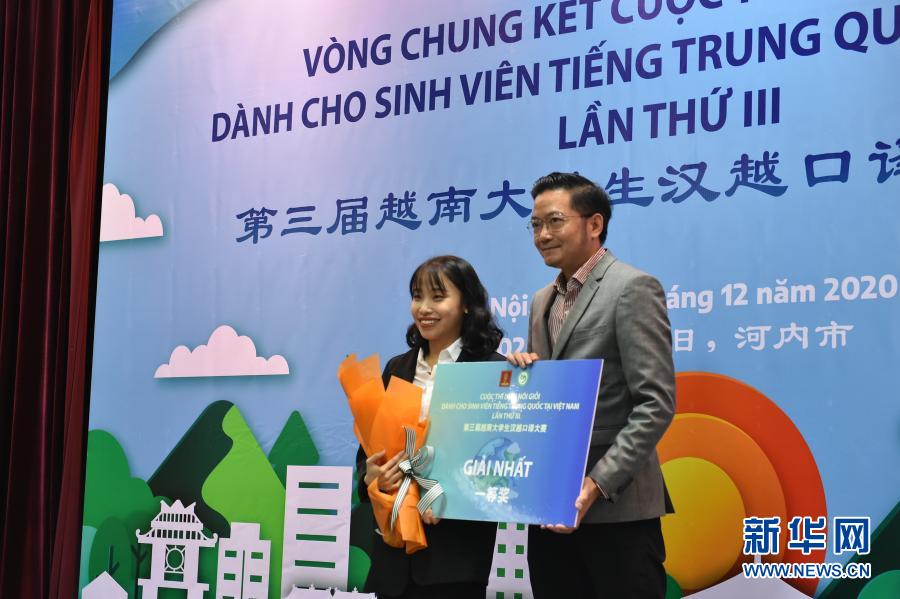 12月13日,在越南首都河內(nèi)舉行的第三屆越南大學(xué)生漢越口譯大賽決賽現(xiàn)場(chǎng),冠軍阮氏明書(左)接受頒獎(jiǎng)。新華社記者 蔣聲雄 攝