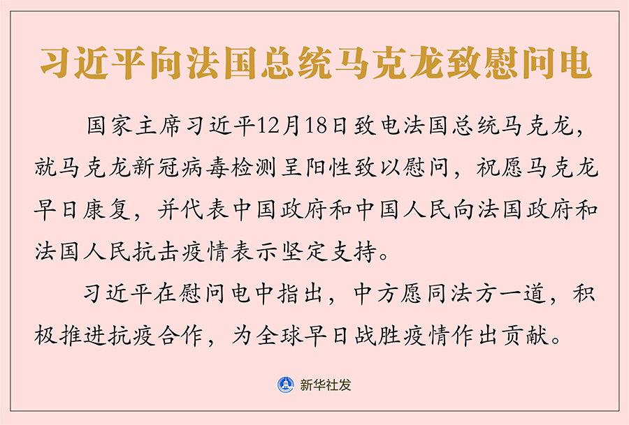 新華社北京12月18日電 國(guó)家主席習(xí)近平18日致電法國(guó)總統(tǒng)馬克龍,就馬克龍新冠病毒檢測(cè)呈陽(yáng)性致以慰問,祝愿馬克龍?jiān)缛湛祻?fù),并代表中國(guó)政府和中國(guó)人民向法國(guó)政府和法國(guó)人民抗擊疫情表示堅(jiān)定支持。