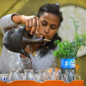 5月14日,一名女商販在埃塞俄比亞亞的斯亞貝巴街頭的咖啡攤等待顧客。