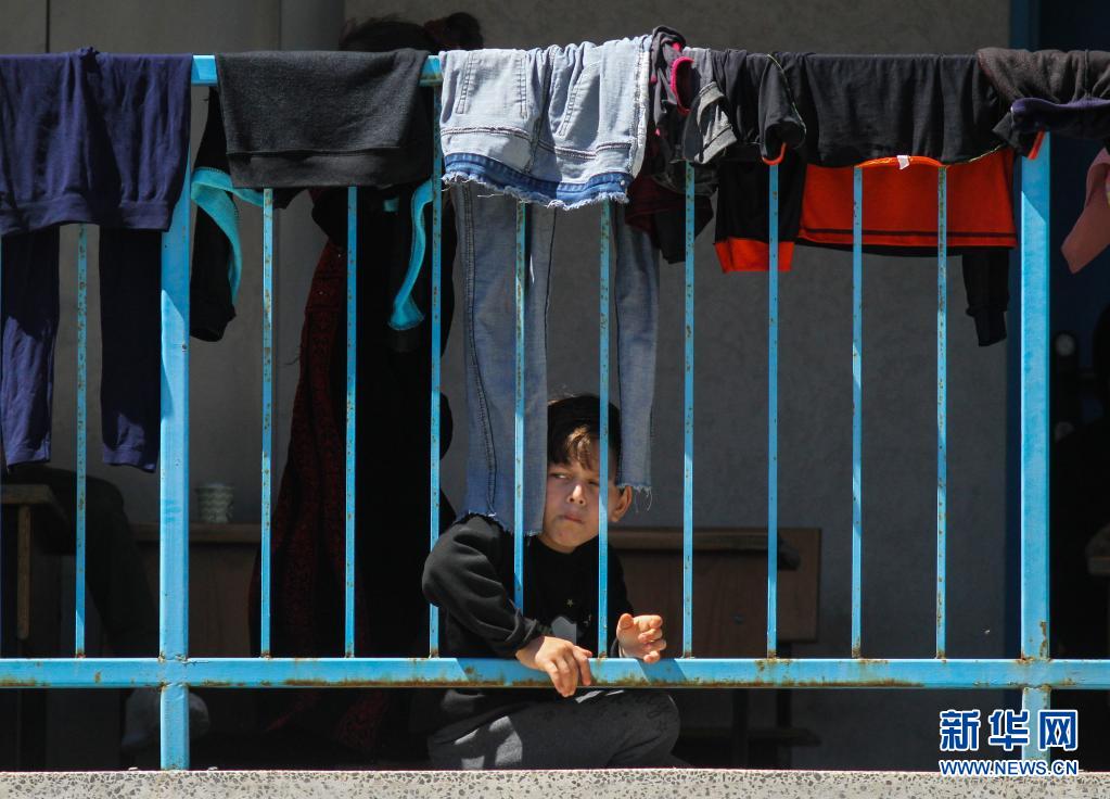 5月19日,受空襲影響而逃離家園的5歲巴勒斯坦兒童艾哈邁德·蘇丹在加沙城的一所學校臨時棲身。