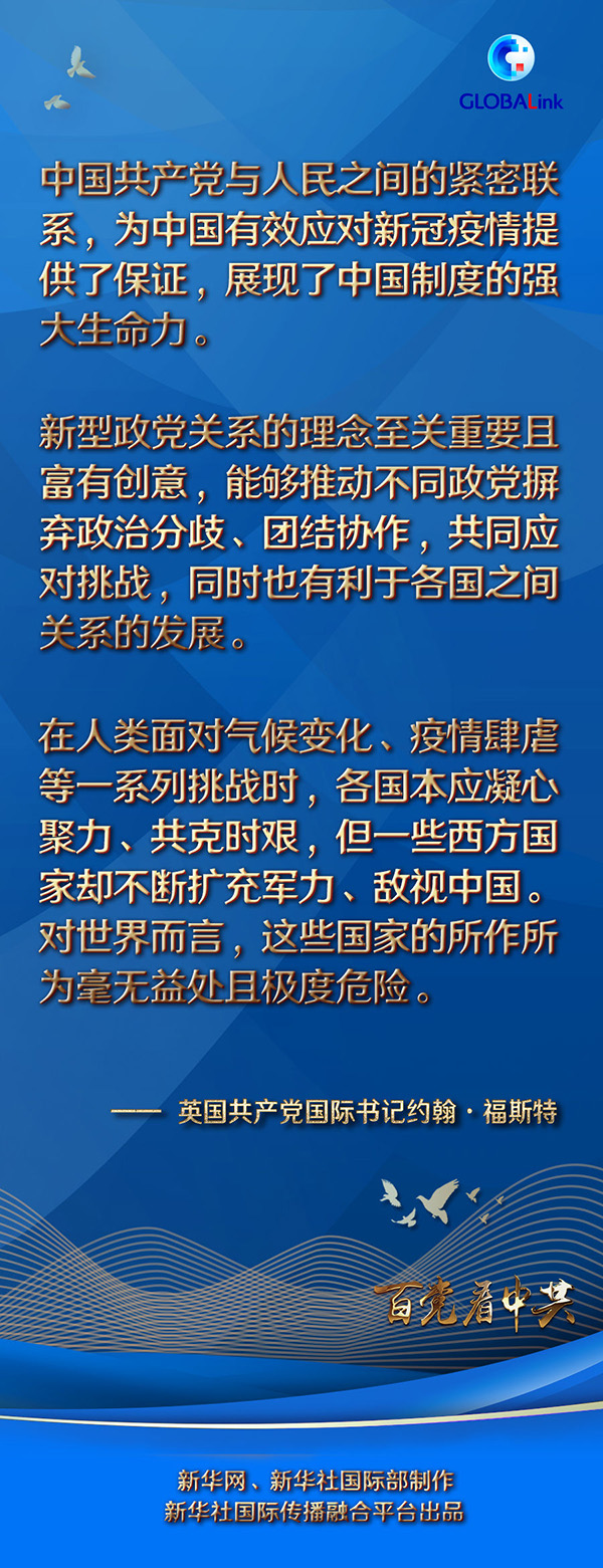 福斯特表示,作為一個(gè)領(lǐng)導(dǎo)著世界上人口最多國(guó)家的百年大黨,中共倡導(dǎo)建立新型政黨關(guān)系和構(gòu)建人類命運(yùn)共同體,對(duì)促進(jìn)世界的和平與發(fā)展具有重要意義。