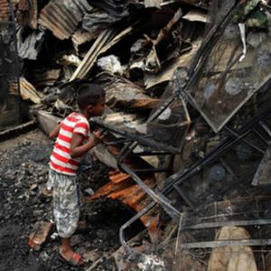 6月7日,一名兒童在孟加拉國首都達(dá)卡發(fā)生火災(zāi)的貧民窟廢墟中尋找個人物品。
