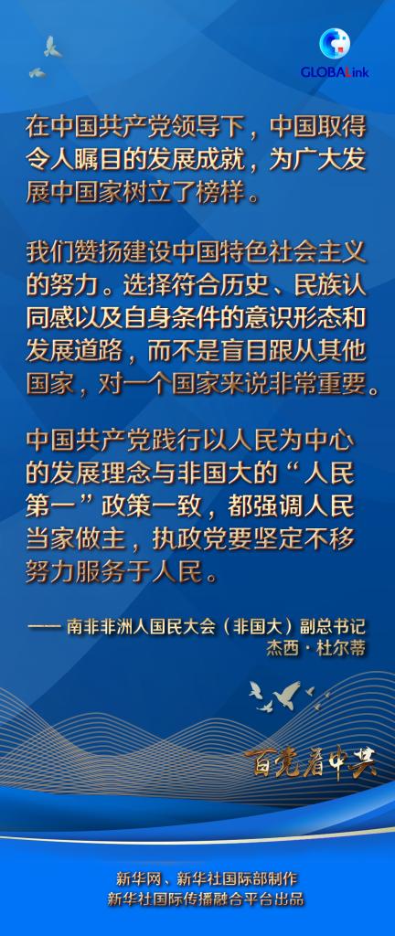 杜爾蒂說,2021年是中國共產(chǎn)黨成立一百周年,中國共產(chǎn)黨創(chuàng)造了一個又一個輝煌。“我謹(jǐn)代表非國大全國執(zhí)行委員會祝賀中國共產(chǎn)黨走過成功的百年。預(yù)祝中國共產(chǎn)黨在下一個百年中取得更大成就!”