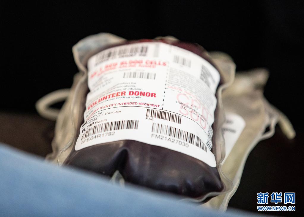 這是6月14日在美國芝加哥的大芝加哥地區(qū)紅十字會一獻血站內(nèi)拍攝的血袋。新華社發(fā)(喬爾·萊納攝)