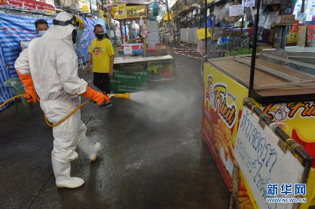 6月21日,工作人員在泰國首都曼谷一處生鮮市場進(jìn)行消毒。
