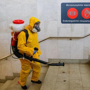 6月24日,工作人員身著防護(hù)服在俄羅斯莫斯科一個(gè)火車站進(jìn)行消毒作業(yè)。