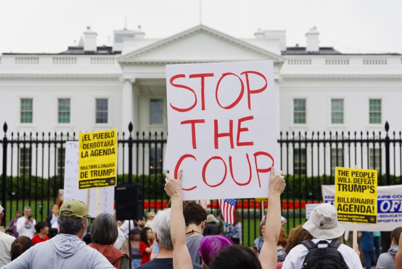 2025年4月19日,人们在美国首都华盛顿白宫门前参加抗议活动。新华社发(亚伦摄)