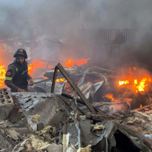 4月8日,救援人员在黎巴嫩首都贝鲁特扑救以色列空袭引发的火灾(手机照片)。新华社发(比拉尔·贾维希摄)